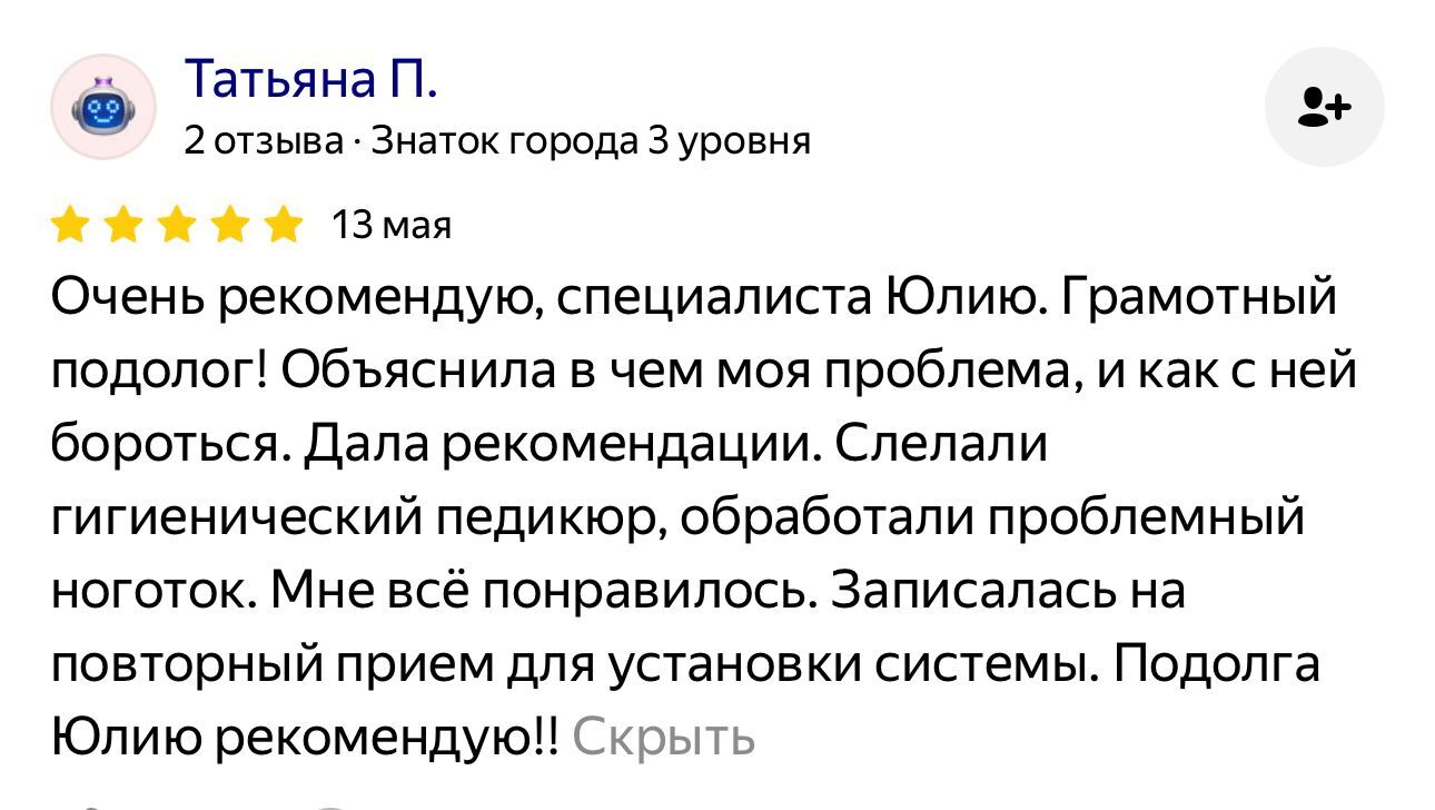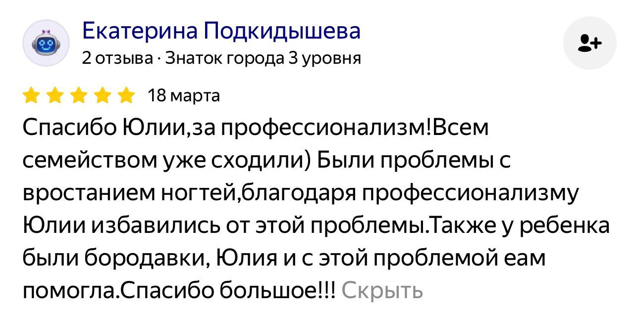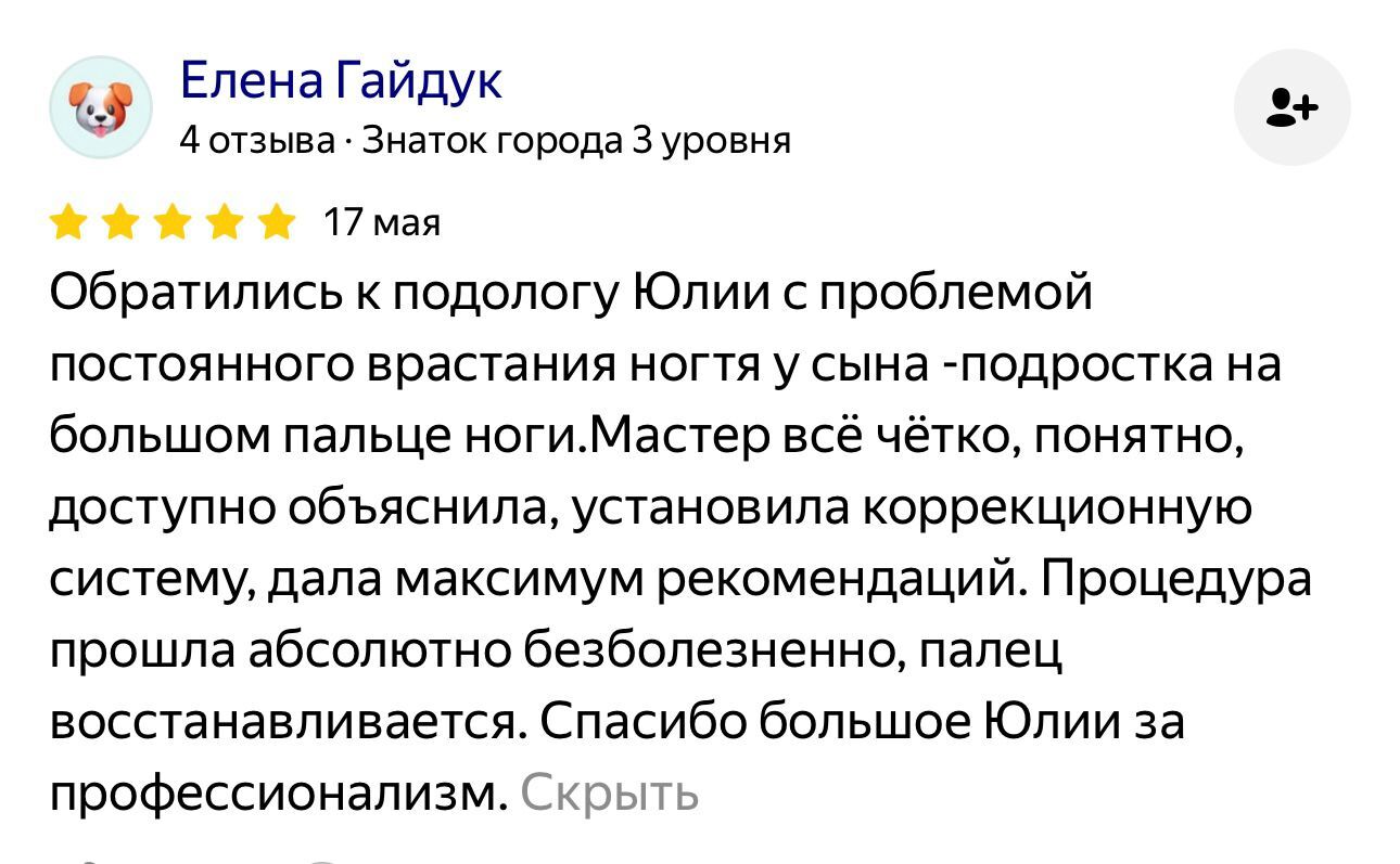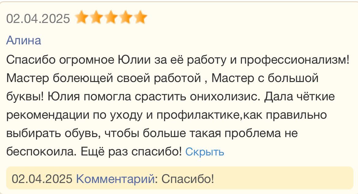 Моя цель — не просто уход, а комплексное решение проблем. Я работаю с каждым клиентом индивидуально, чтобы вернуть вашим ногам здоровье, а вам — уверенность в каждом шаге !