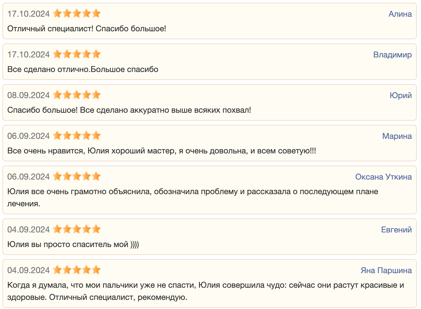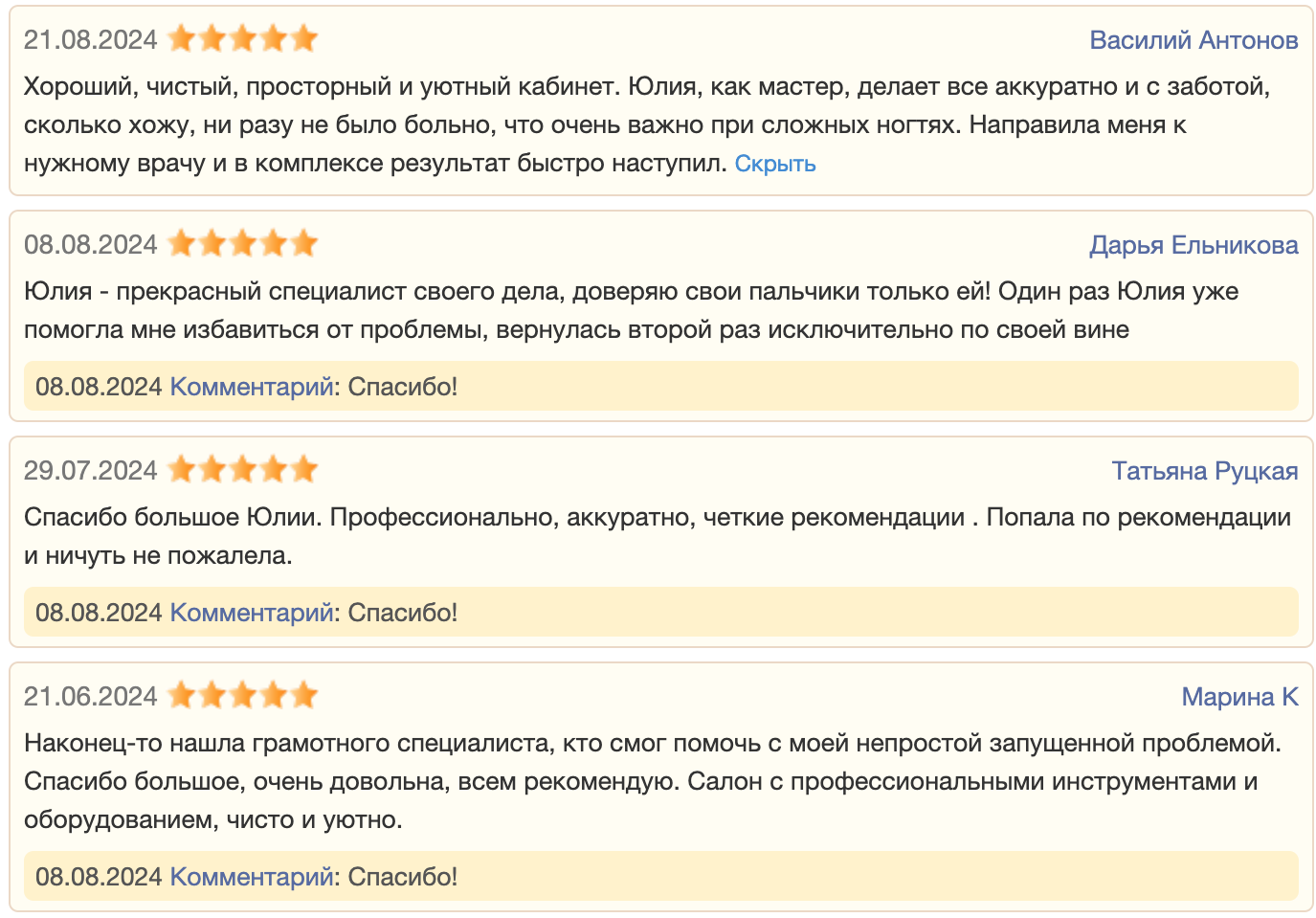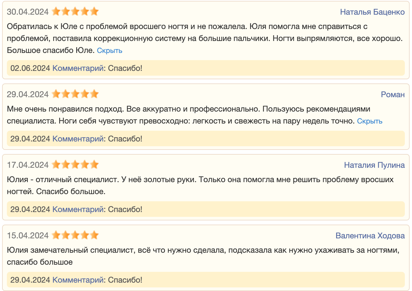 Моя цель — не просто уход, а комплексное решение проблем. Я работаю с каждым клиентом индивидуально, чтобы вернуть вашим ногам здоровье, а вам — уверенность в каждом шаге !